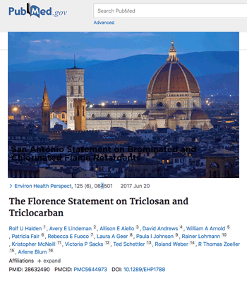 In 2016 the Green Science Policy Institute worked with partners to draft the Florence Statement, which documented current scientific research on triclosan and triclocarban. This consensus statement concluded that these antimicrobials do not provide health benefits but do cause health and environmental harm. The statement also called for greater caution in using antimicrobial chemicals in everyday products. It was signed by more than 200 international scientists and medical professionals and published in the peer-reviewed journal Environmental Health Perspectives.